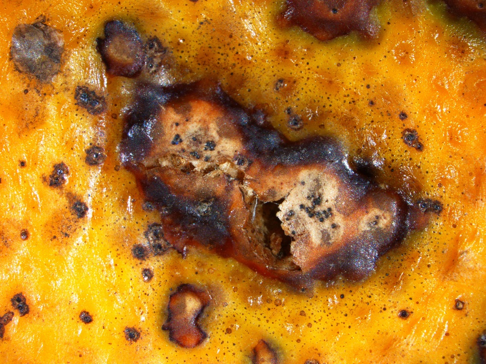 Tổn thương đốm tàn nhang là những tổn thương hình tròn, lõm, có đường kính 1-3 mm và có màu đỏ. Loại triệu chứng này được coi là dấu hiệu của nhiễm trùng nặng. Các tổn thương đốm tàn nhang có thể vẫn là các tổn thương đơn lẻ hoặc kết hợp với nhau để tạo thành loại tổn thương đốm độc lực mạnh hơn vào cuối mùa hoặc trong quá trình bảo quản.