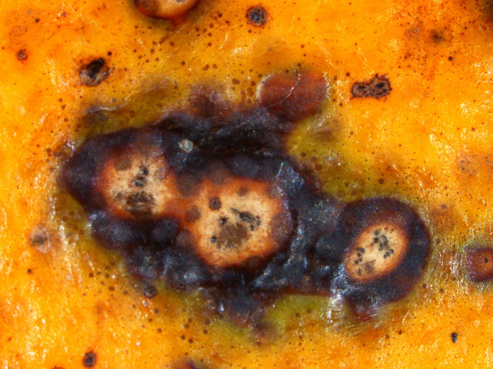 Vết bệnh đốm độc xuất hiện trên quả trưởng thành bị nhiễm bệnh nặng vào cuối vụ sinh trưởng và là những vết bệnh hoại tử, lõm xuống và không đều bao phủ một vùng lớn quả. Triệu chứng này là do sự mở rộng và / hoặc hợp nhất của các tổn thương khác. Vết bệnh có thể kèm theo rụng quả sớm và thiệt hại nghiêm trọng sau thu hoạch vì vết bệnh có thể kéo dài vào phần thịt của quả.